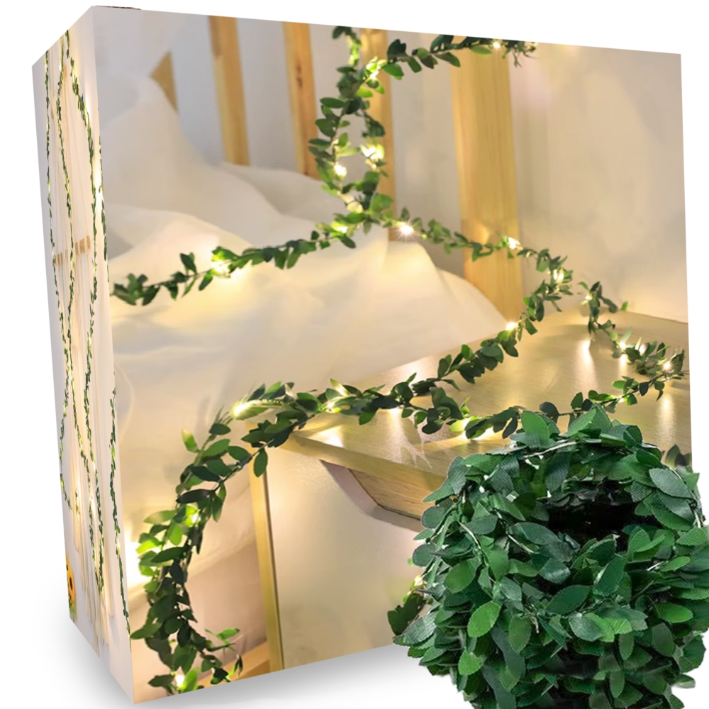 Girlanda z listkami i lampkami to dekoracyjne oświetlenie tworzące nastrojowy klimat. Pasuje na codzień jak i na specjalne okazje.Nawet wyłączona stanowi ozdobny element dekoracyjny. Zasilanie bateryjne pozwoli na aranżacje w wielu miejscach.