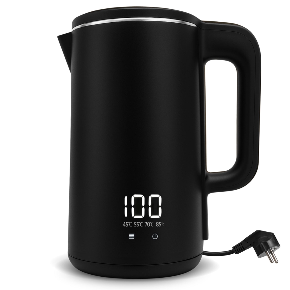 Czajnik elektryczny z panelem dotykowym zapewnia precyzyjną i intuicyjną regulację temperatury w zakresie od 45°C do 100°C. Funkcja podtrzymania temperatury pozwala przygotować w szybki sposób ulubiony napój lub mleko dla dziecka bez zbędnego czekania. Ten praktyczny czajnik znacznie ułatwi codzienne funkcjonowanie i pozwoli przygotować kawę lub herbatę uzyskując jak najlepsze walory smakowe. Obudowa w kolorze satynowej czerni i estetyczny design sprawiają, że czajnik można użytkować nie tylko w domowej kuchni ale również w biurach czy pomieszczeniach socjalnych dla pracowników. Będzie idealnym elementem wystroju zarówno tradycyjnych jak i nowoczesnych pomieszczeń.