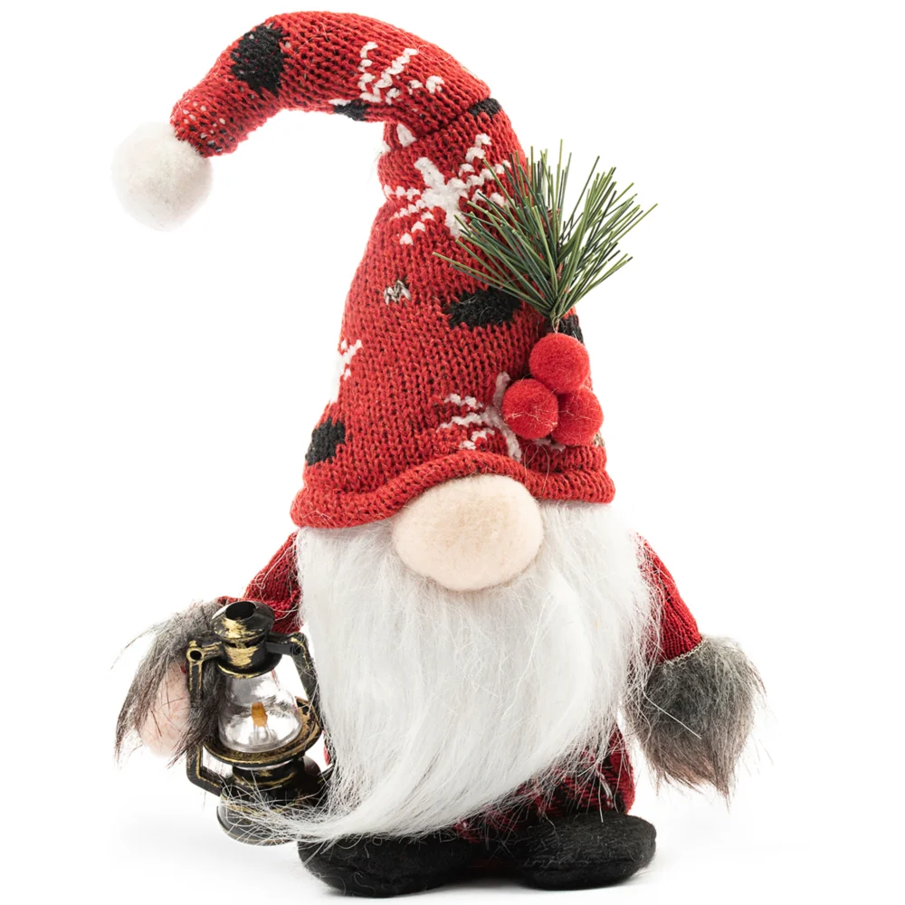 W jednym ręku skrzat trzyma małą latarnię, która kojarzy się z światłem i ciepłem podczas mroźnej zimy, dodając magii i blasku świątecznej atmosferze.