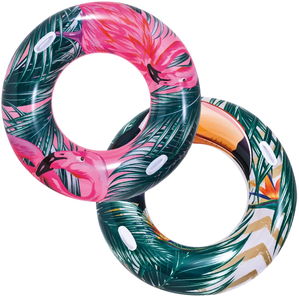 Realistyczne roślinne nadruki na powierzchni koła z pewnością wyróżnią jego użytkownika na tle innych plażowiczów i przyciągnie wzrok niejednej osoby. Tropikalne wzory z motywem ptaków flaminga i tukana zostały stworzone specjalnie dla osób, które nie znoszą nudy i lubią dobrze się bawić. Żywe kolory koła sprawiają, że zdjęcia wykonane z dmuchańcem w tle będą idealne do publikacji w mediach społecznościowych.