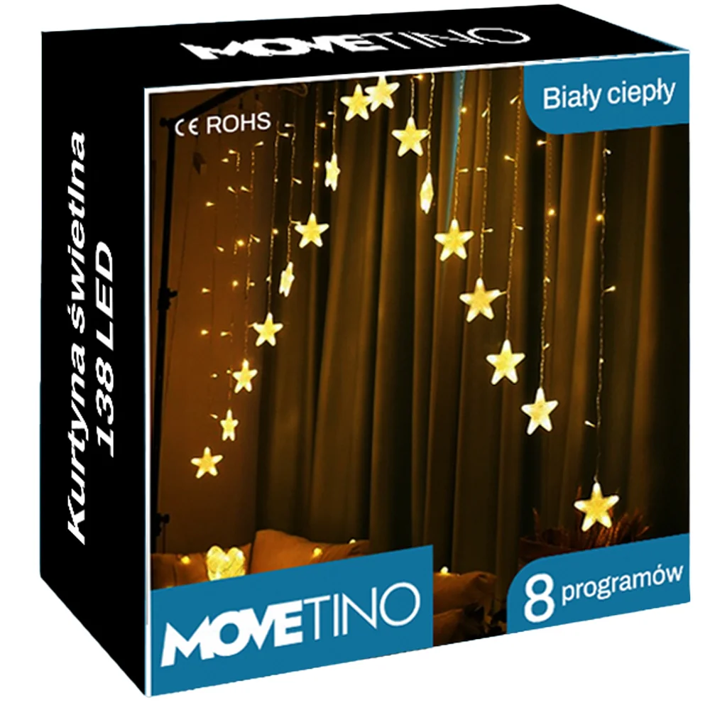 Lampki świąteczne w formie kurtyny w gwiazdki. Ta niezwykła dekoracja świetlna nie tylko pięknie ozdobi Twoje wnętrza, ale także wprowadzi w nie magiczny nastrój tradycyjnych świąt Bożego Narodzenia. Girlandę świetlną można używać również na zewnątrz.