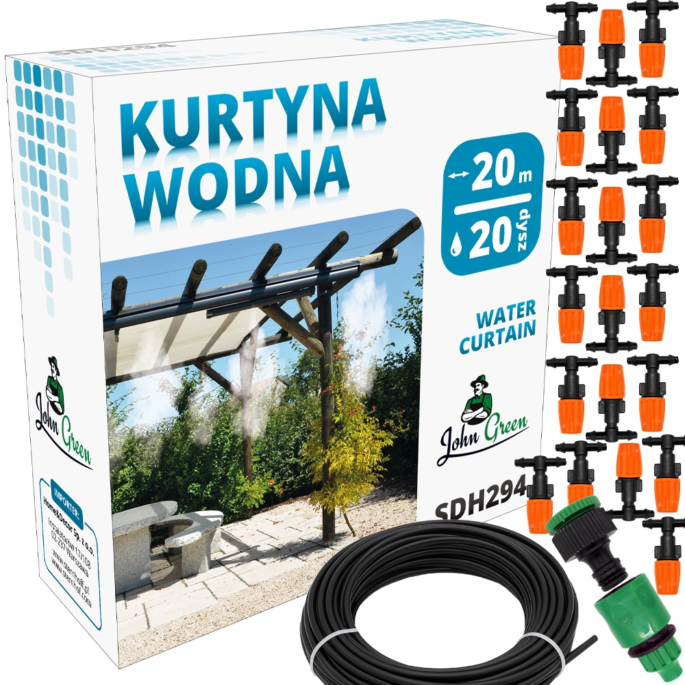 Kurtyna wodna 20m z 20 dyszami tworzy równomierny strumień wody, idealny do ochłody w upalne dni. Prosta w montażu – wystarczy podłączyć do węża ogrodowego i gotowe. Tworzy ładny efekt wizualny w ogrodzie.