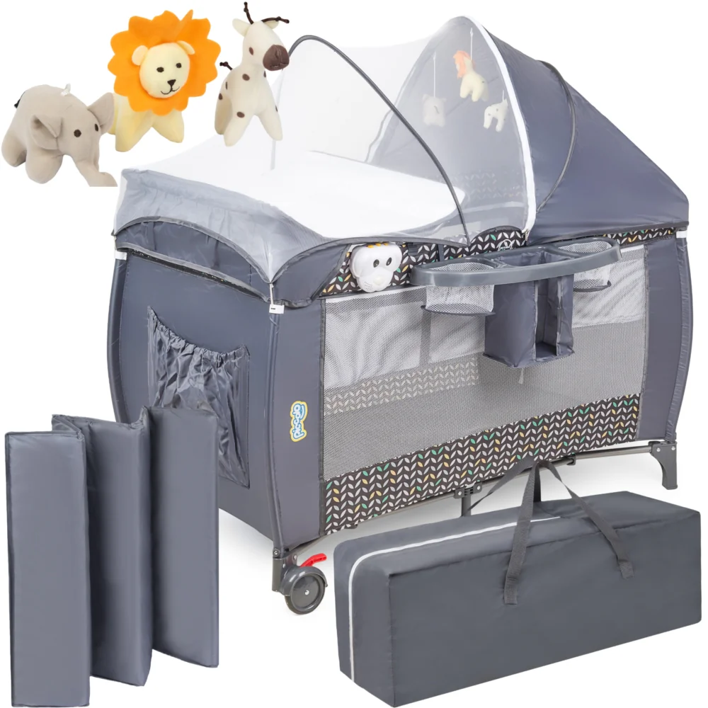 Łóżeczko turystyczne składane z bogatym zestawem dodatków oraz regulacją wysokości