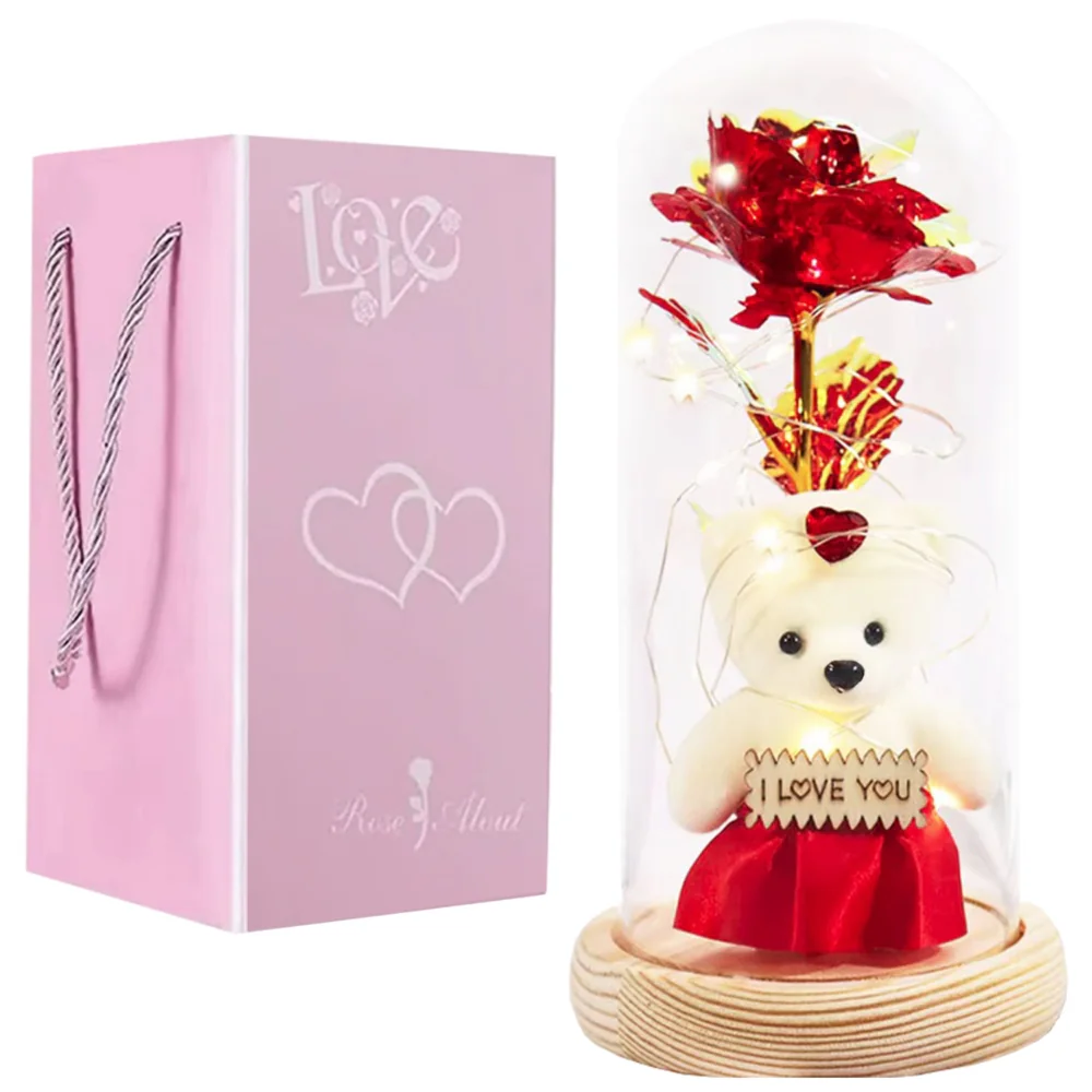 Wieczna róża w szkle z podświetleniem LED + Miś "I love you"